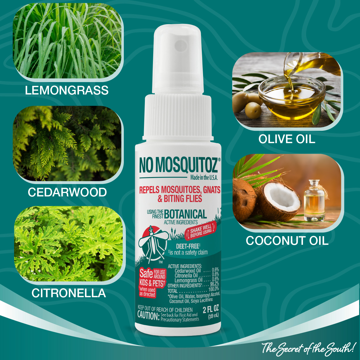 No Mosquitoz® botanical insect repellent is made with the finest botanical active ingredients, including cedarwood, citronella and lemongrass oils. Works safely* and effectively against mosquitoes. Also effective against gnats and biting flies. DEET-free formula†. Safe for use around kids and pets*. Non-greasy, non-sticky formula. Made with olive and coconut oils. Pleasant, woodsy scent. Made in USA.