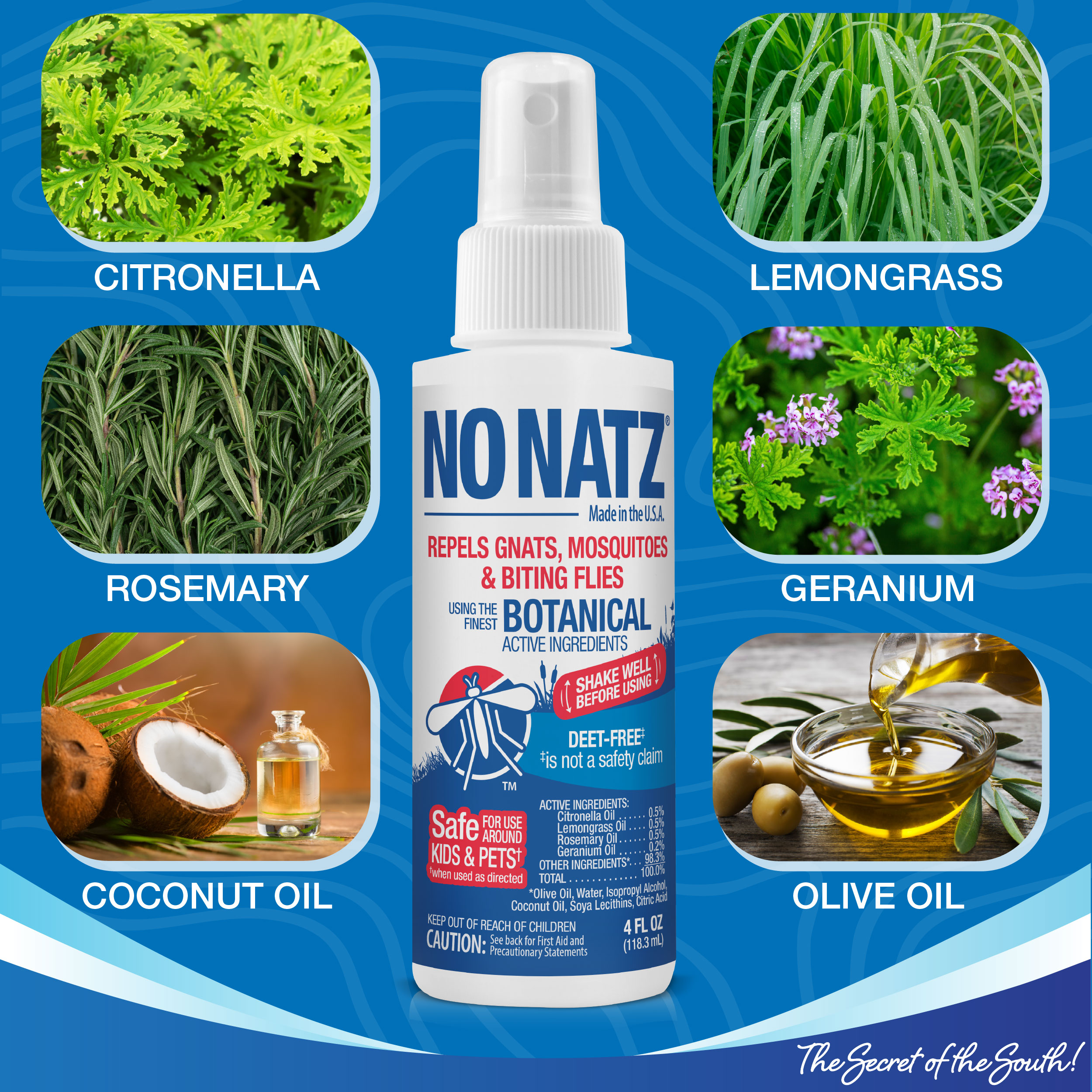 Developed in the marshes of Savannah, Georgia, No Natz® products are known as the “Secret of the South” for their effectiveness against a variety of biting insects. Crafted with the finest ingredients and safe for use around children and pets*. Enjoy the outdoors again with No Natz® products.