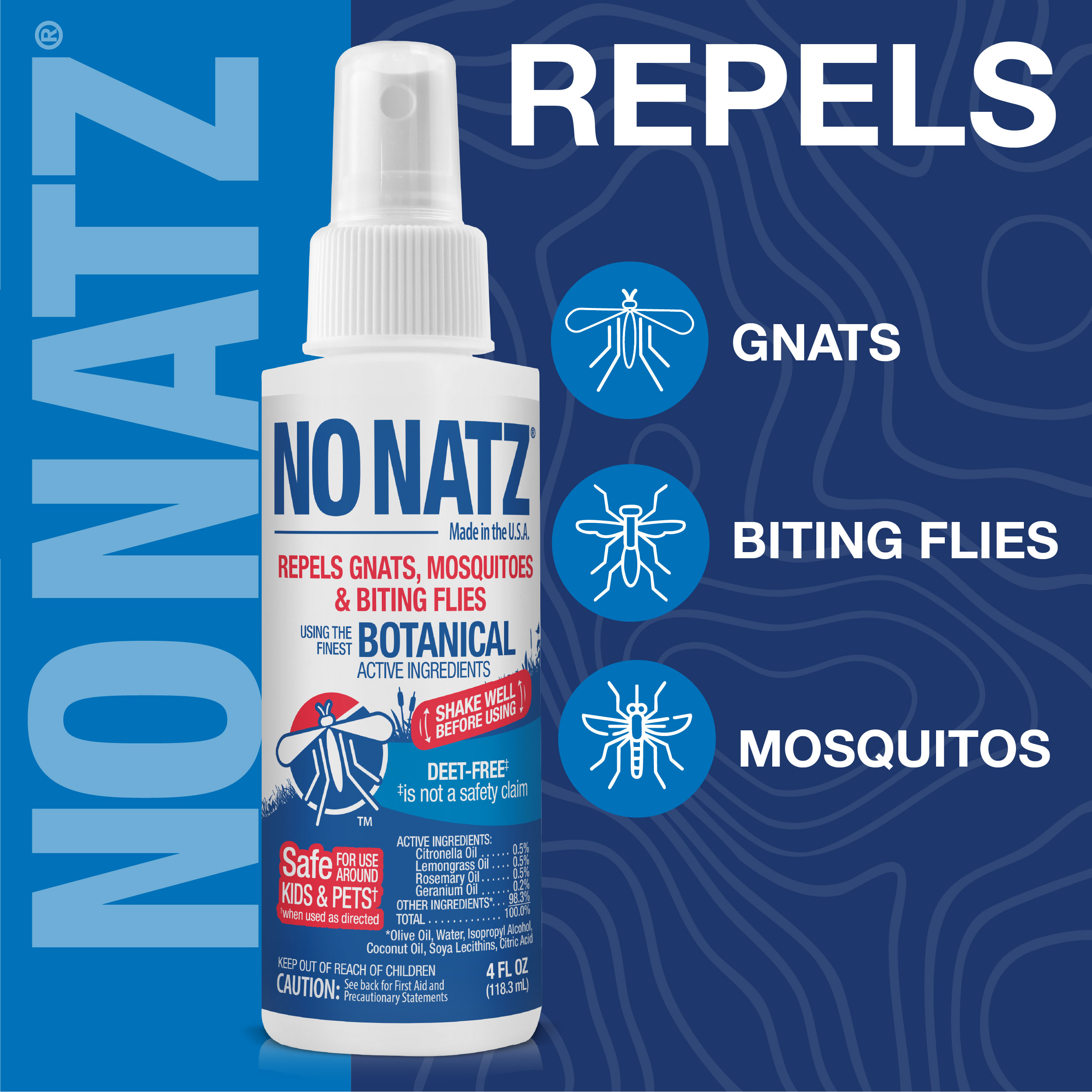No Natz® botanical insect repellent is made with the finest botanical active ingredients, including citronella, lemongrass, rosemary and geranium oils. Works safely* and effectively against gnats, biting flies and mosquitoes. DEET-free formula†. Safe for use around kids and pets*. Non-greasy, non-sticky formula. Made with olive and coconut oils. Pleasant, fresh scent. Made in USA.