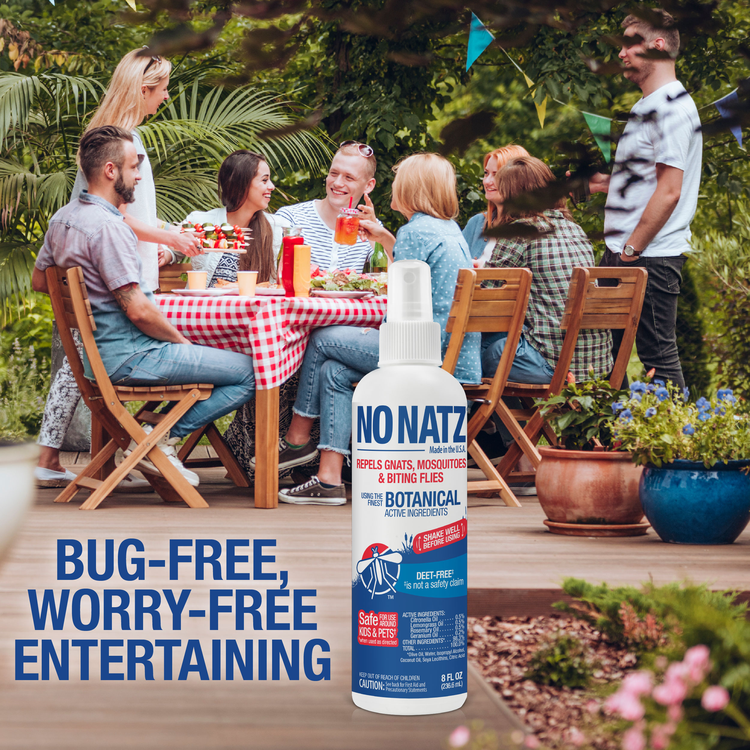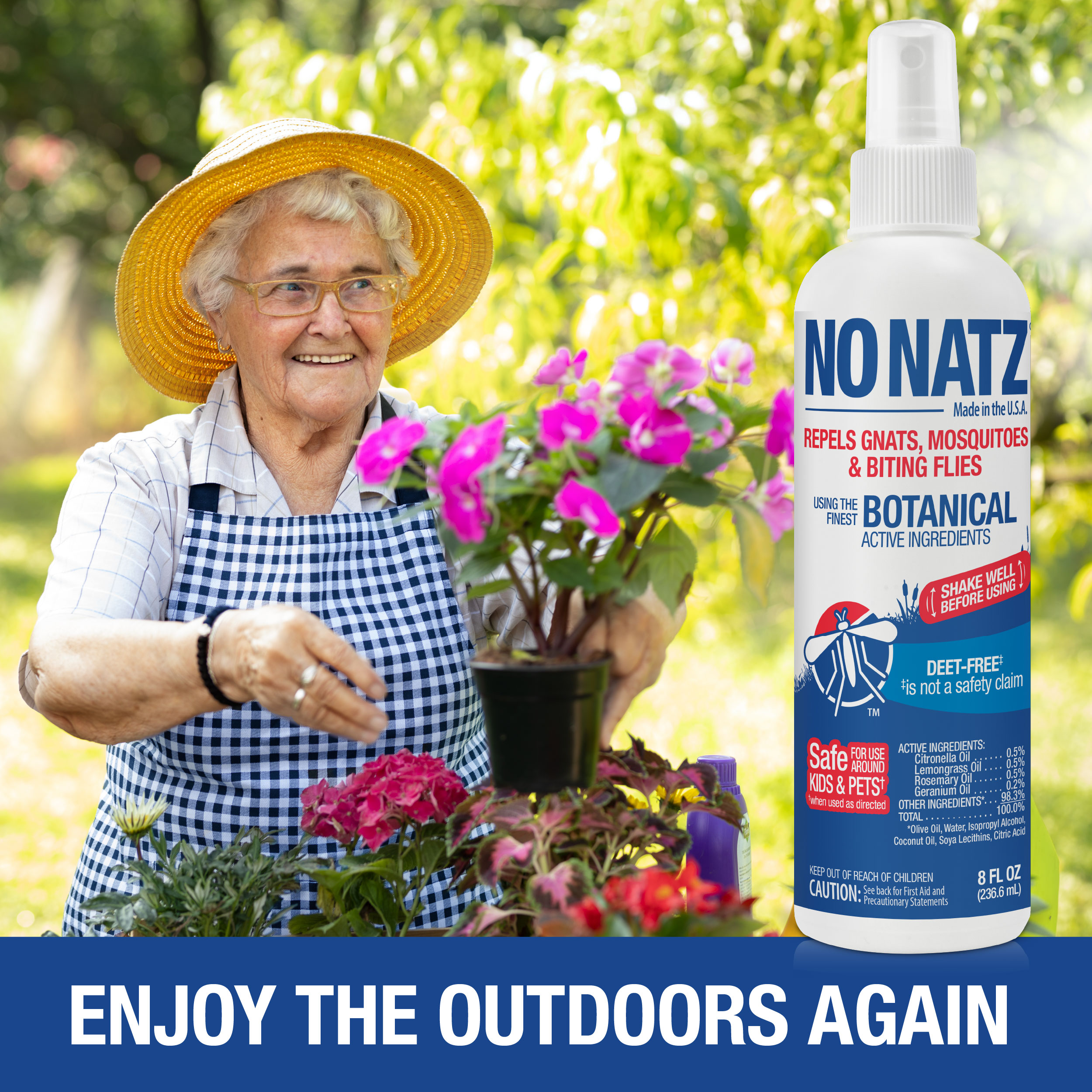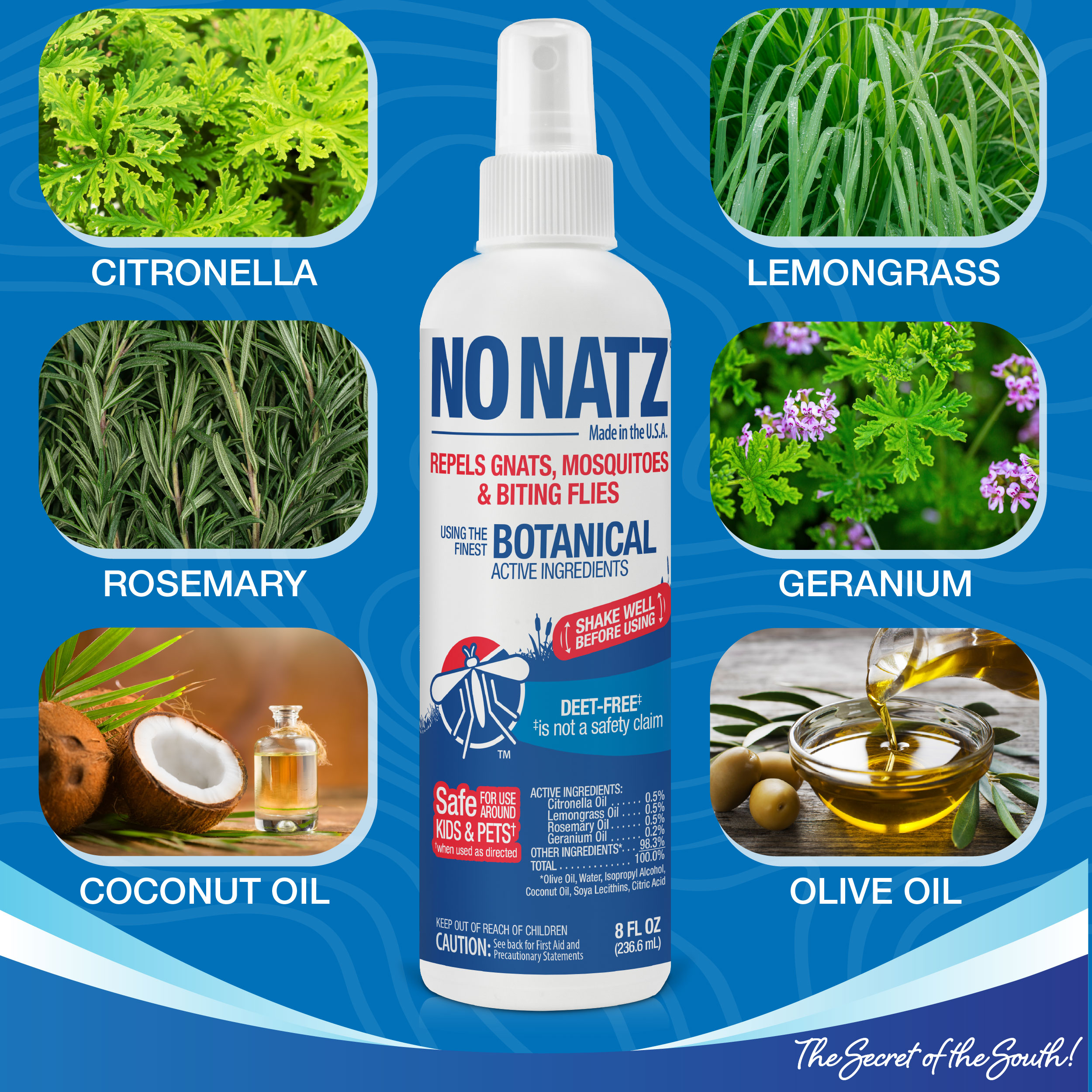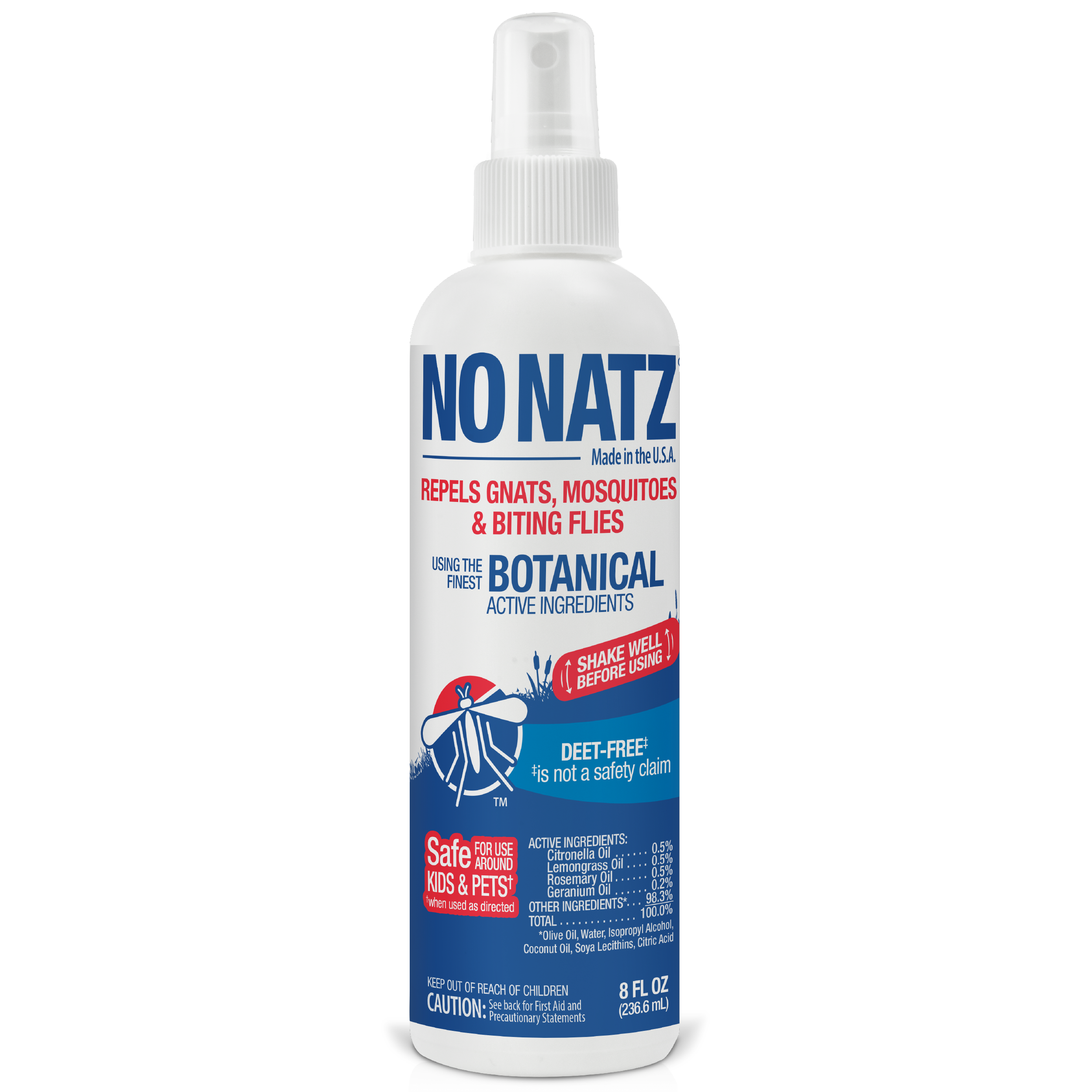 No Natz® botanical insect repellent is made with the finest botanical active ingredients, including citronella, lemongrass, rosemary and geranium oils. Works safely* and effectively against gnats, biting flies and mosquitoes. DEET-free formula†. Safe for use around kids and pets*. Non-greasy, non-sticky formula. Made with olive and coconut oils. Pleasant, fresh scent. Made in USA.